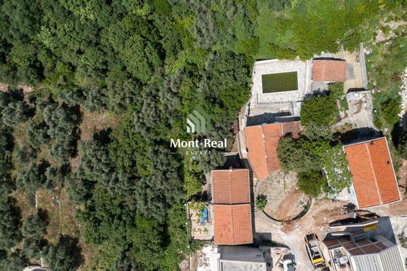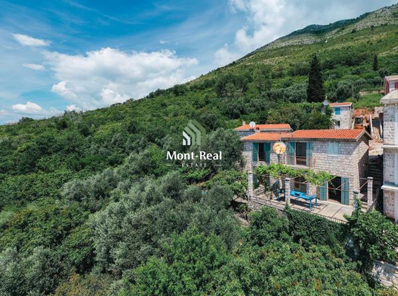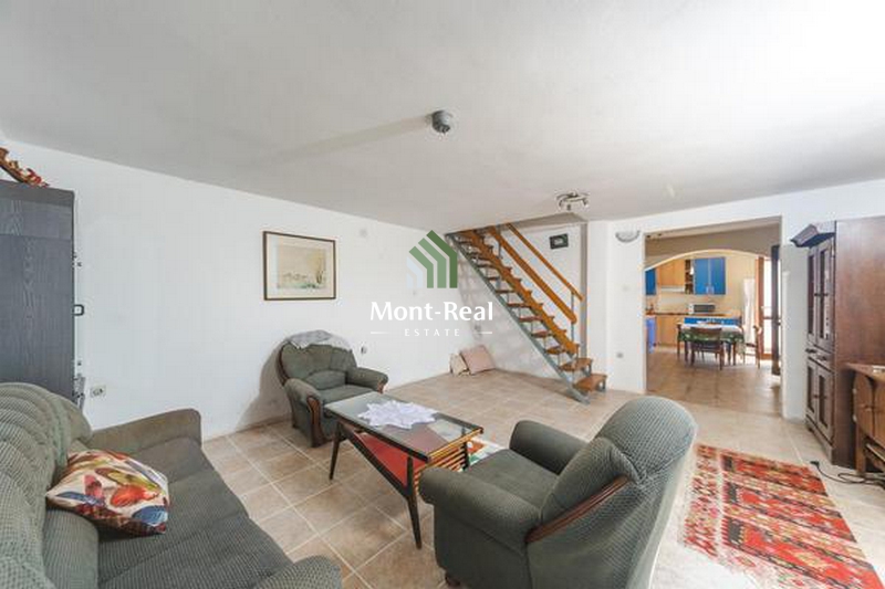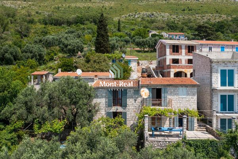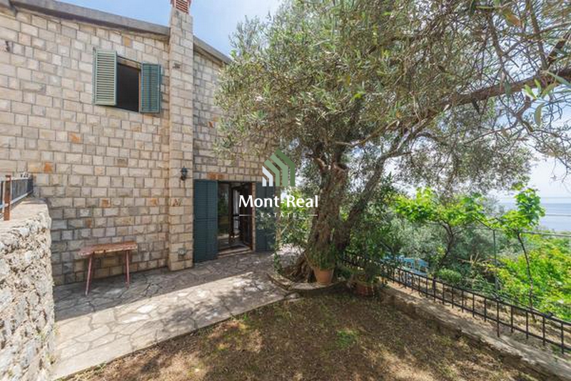 -U prizemlju se nalazi prostrani osvijetljeni dnevni boravak sa kuhinjom, trpezarijom, kupatilom i jednom ostavom. Cijeli taj prostor je jako osvijetljen i prozračan, samim tim sto ima četiri velika izlaza na ogromnu terasu sa pogledom na more i okrenut je ka jugu. Velika prostrana terasa je dio gdje se maksimalno može uzivati veći dio godine u hladovini vinove loze. U bočnom dijelu kuće je jos jedna terasa sa sazidanim rostiljem i starim maslinama. Ispod njih, kaskadno, se nalazi jos jedan dio placa, koji se može lijepo iskoristiti za sadnju primorskog rastinja. U čitavom okruženju su sve nove vile sa bazenima i predivnim pejzažem, prepunim zelenila i maslinjaka. Pogled je božanstven, 180 stepeni otvoreno more i ako uključimo u sve to mir i tišinu, nekretnina je idelana za one ljude koji su željni da pobjegnu iz grada i gradskog užurbanog života.