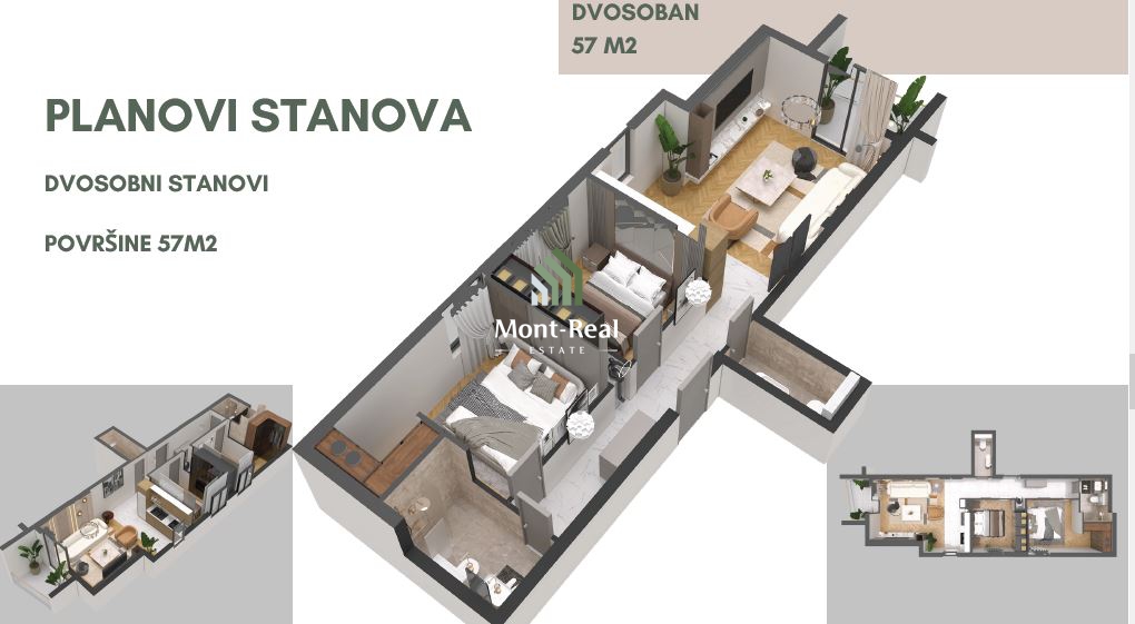 U ponudi je više apartmana različitih struktura i spratnosti u okviru istog objekta. Garažna mjesta su dostupna uz doplatu.