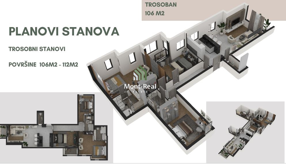 Na prodaju trosoban stan u izgradnji površine 106m², smješten u naselju Boreti, Bečići, na jednoj od najtraženijih lokacija između Budve i Bečića. Udaljen je svega 300 metara od mora i na nekoliko minuta laganog hoda do plaže i hotela Dukley.