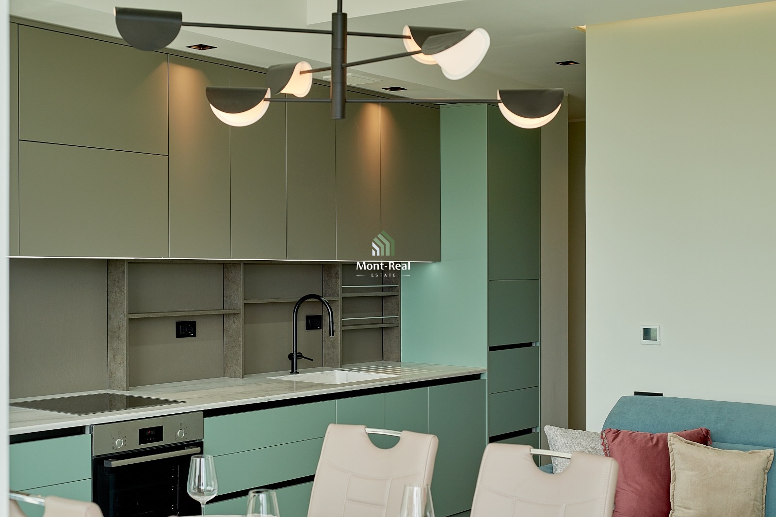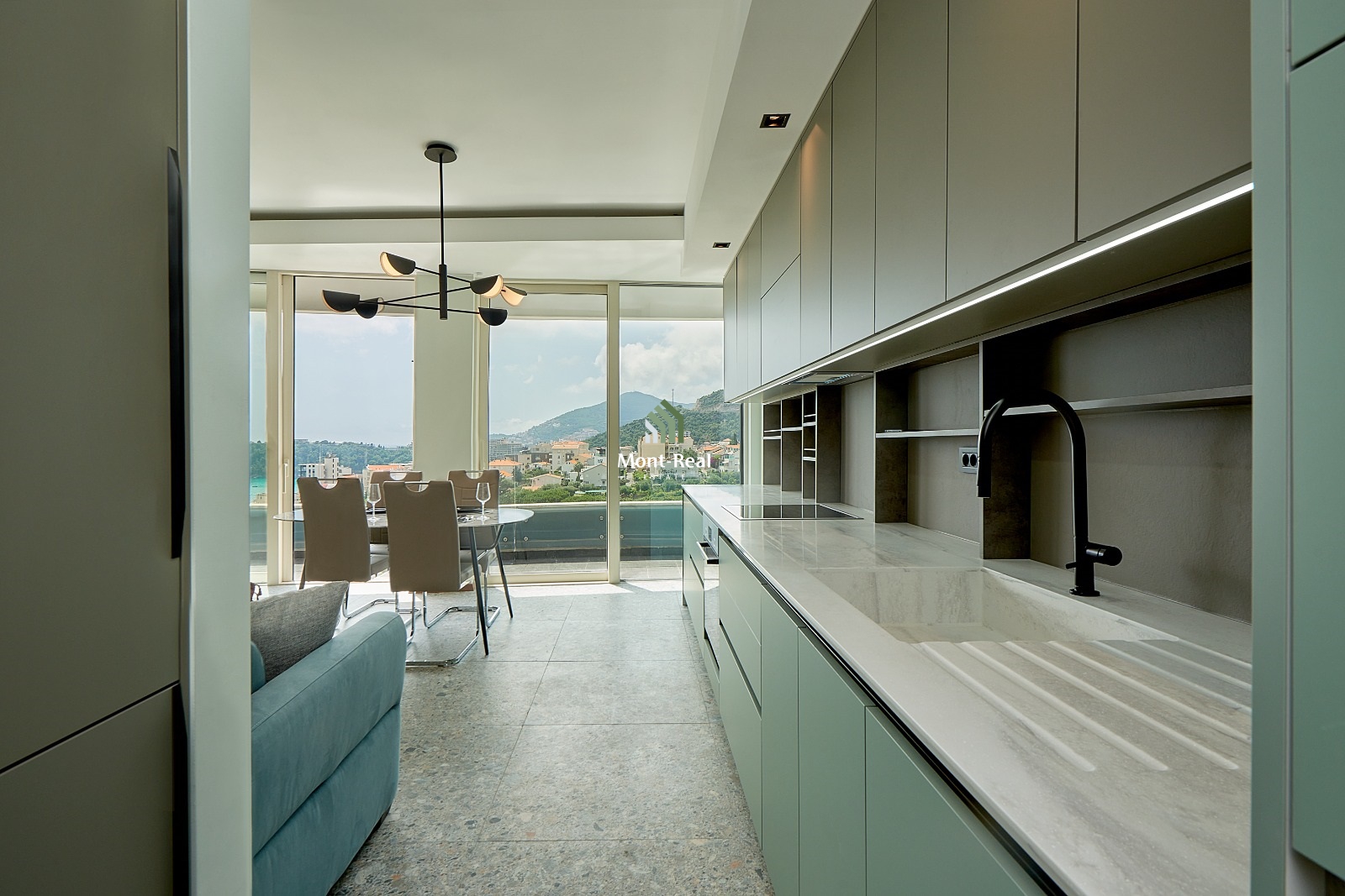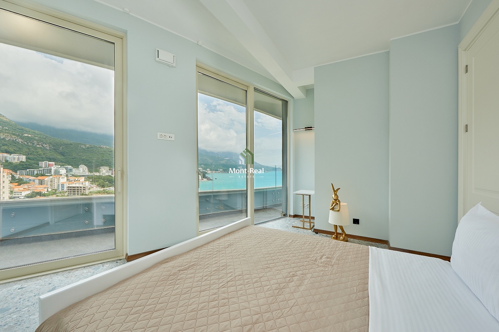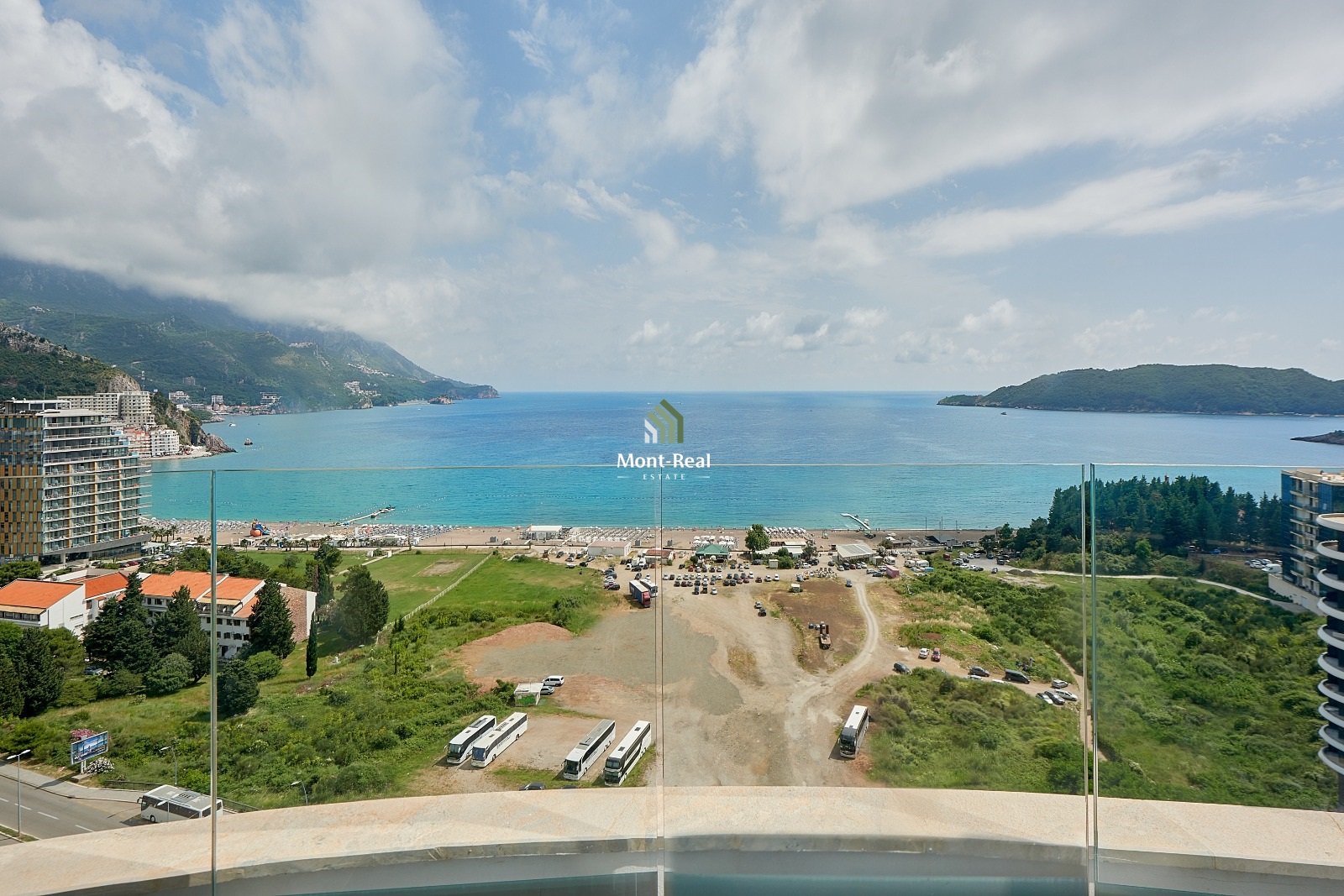 Площадь квартиры составляет 115 м²; она расположена на 10 этаже здания с лифтом и обладает чистым, постоянным панорамным видом на море. Особую ценность придаёт большая терраса, которая проходит вдоль всей квартиры, объединяя все помещения и открывая захватывающий вид на Будву, Бечичи и вплоть до Святого Стефана. Большие стеклянные поверхности и выходы на террасу из нескольких комнат обеспечивают много естественного света и ощущение простора.